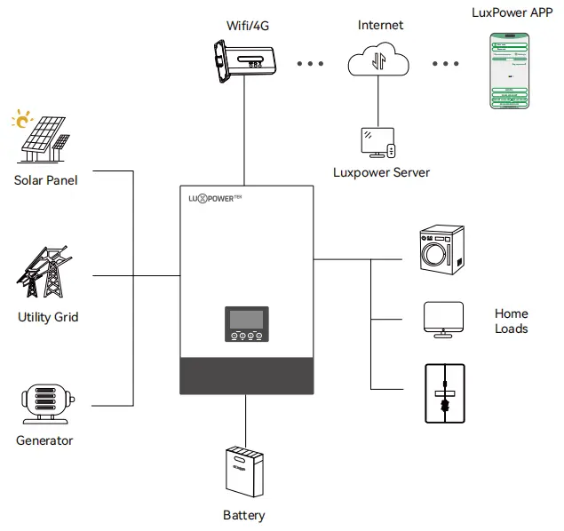 লাক্সপাওয়ার এসএনএ 6000 অফ-গ্রিড ইনভার্টার ডিসি-ডিসি রূপান্তরকারী সিস্টেমগুলিকে সমর্থন করে, নির্ভরযোগ্য ব্যাকআপ শক্তি বা একটি ডিজেল জেনারেটর প্রতিস্থাপন হিসাবে পরিবেশন করে। সমান্তরাল কার্যকারিতা সহ, সিস্টেমের ক্ষমতা 6kW থেকে 96kW পর্যন্ত স্কেল করে। ইনভার্টার ডিসি-ডিসি রূপান্তরকারী ওয়ার্কিং মোডগুলিকে সমর্থন করে: