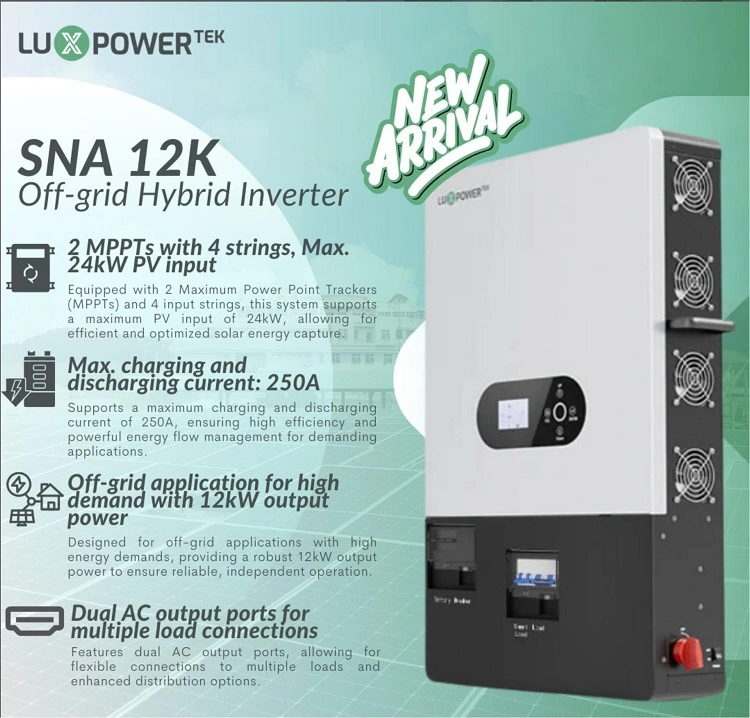 অফ-গ্রিড পাওয়ার সলিউশনগুলিতে লাক্সপাওয়ার সর্বশেষ যুগান্তকারী, সানলিঙ্কের লাক্সপাওয়ার এসএনএ-ইইউ 12000 মডেল, একটি শক্তিশালী পাওয়ার আউটপুট 12 কেডব্লু সরবরাহ করে। নির্ভরযোগ্যতা এবং বহুমুখীতার জন্য ডিজাইন করা, এটি বিভিন্ন অ্যাপ্লিকেশন জুড়ে বিরামবিহীন শক্তি পরিচালনা সরবরাহ করে।