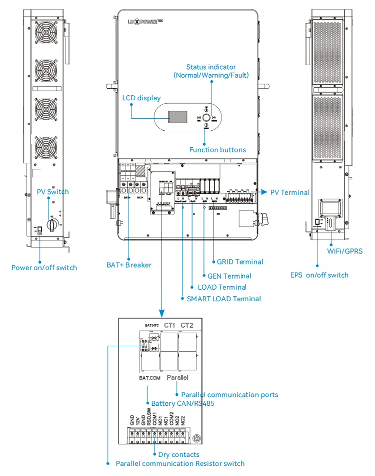এর মডুলার ডিজাইনটি 16 টি ইউনিট পর্যন্ত সমান্তরাল সংযোগকে সমর্থন করে, বিভিন্ন শক্তির চাহিদা মেটাতে বর্ধিত স্কেলিবিলিটি সরবরাহ করে। অর্ধ-তরঙ্গ লোড সমর্থন করে এমন একটি স্বাধীন লোড পোর্ট দিয়ে সজ্জিত, এটি বিভিন্ন লোডের প্রয়োজনীয়তা পরিচালনা করতে ব্যতিক্রমী ক্ষমতা প্রদর্শন করে। লাক্সপাওয়ার এসএনএ-ইইউ 12000 এ 100 এ পাস-থ্রু সক্ষমতা এবং একটি ডেডিকেটেড জেনারেটর পোর্ট বৈশিষ্ট্যযুক্ত, যা বিদ্যমান অন-গ্রিড সিস্টেমগুলির সাথে বিরামবিহীন সংহতকরণ সক্ষম করে।